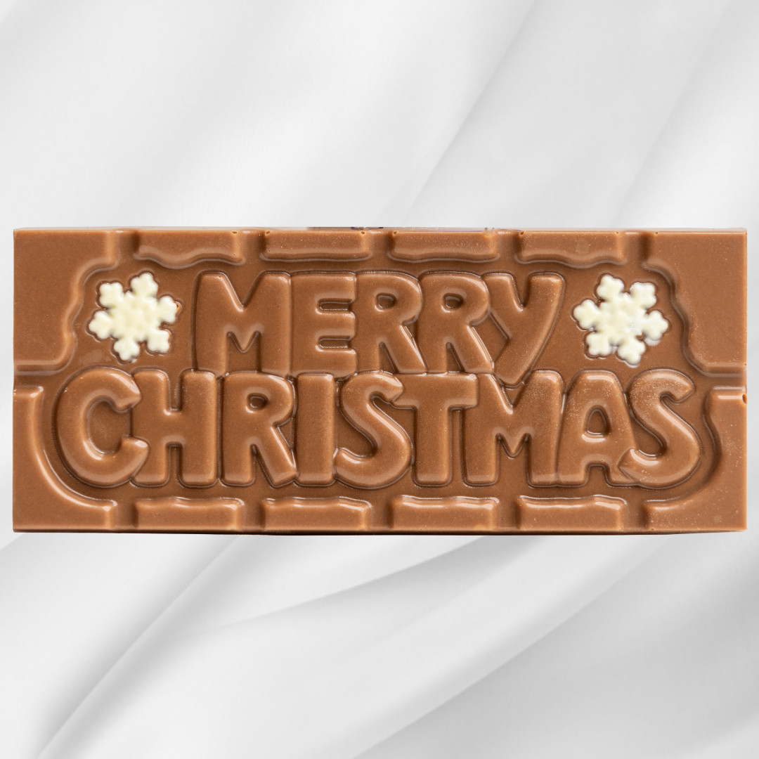 Merry Christmas! sjokoladeplate – en harmoni av melkesjokolade og karamellsjokolade. Den perfekte julehilsenen.