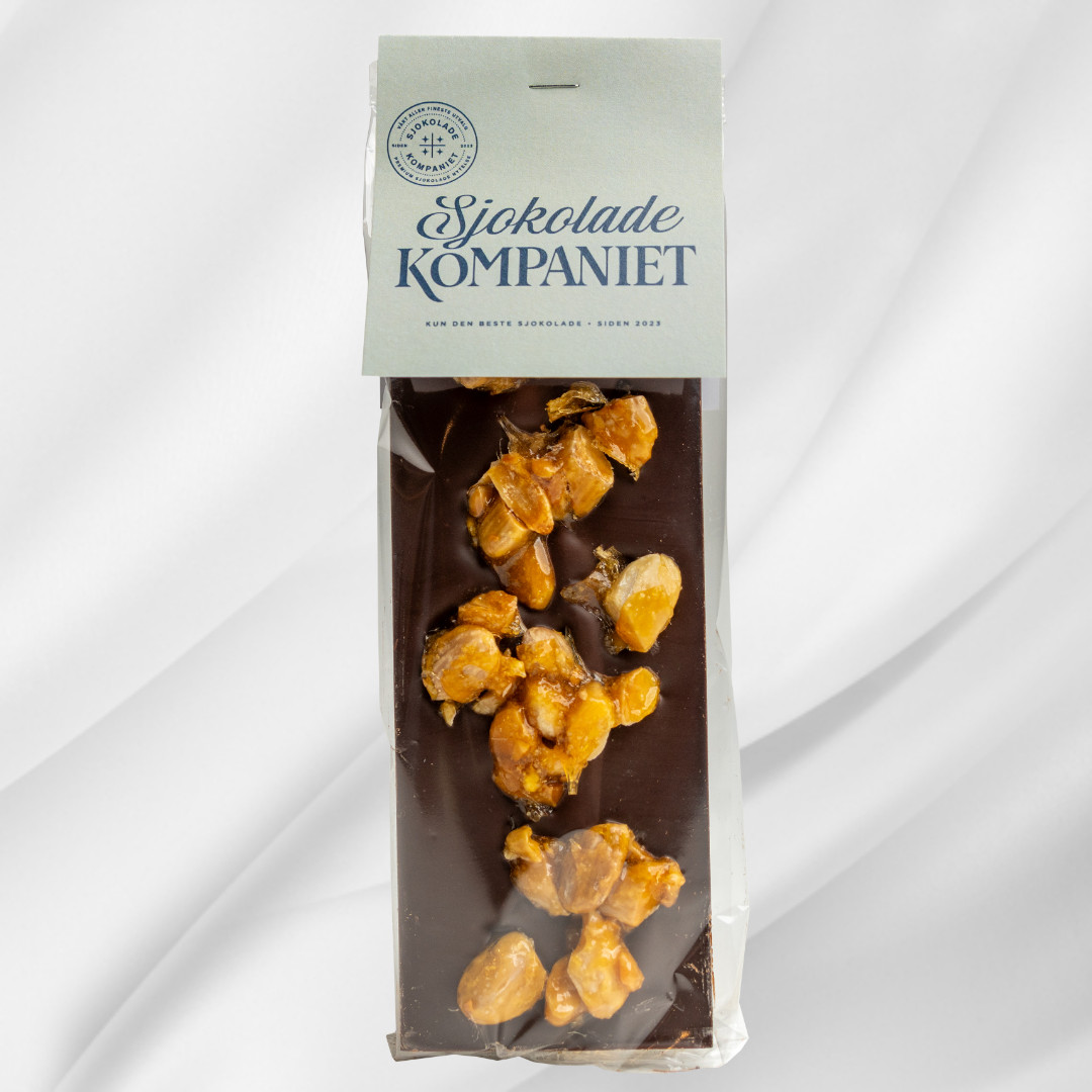Karamellisert Mandel sjokoladeplate – 61 % mørk sjokolade toppet med hele karamelliserte mandler. Sprø karamellknas og dyp kakaosmak i deilig balanse.