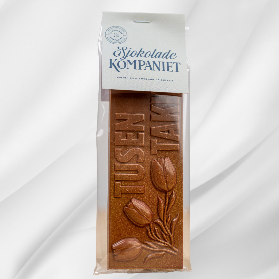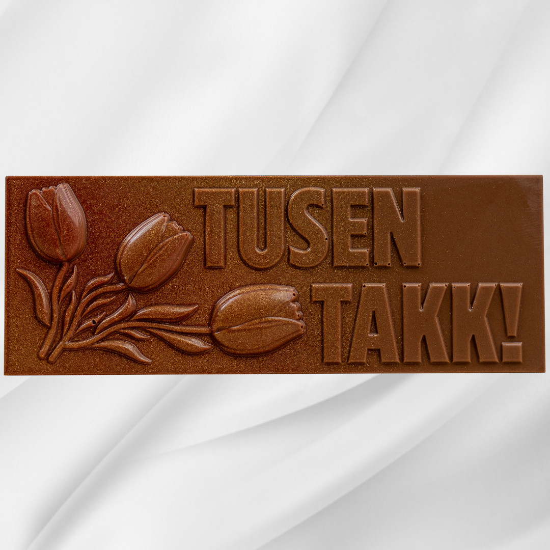 Tusen Takk! sjokoladeplate – en delikat blanding av melkesjokolade og karamellsjokolade. Den ideelle gaven når du synes noen fortjener en påskjønnelse for god innsats.